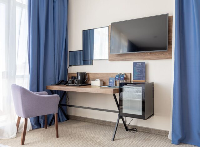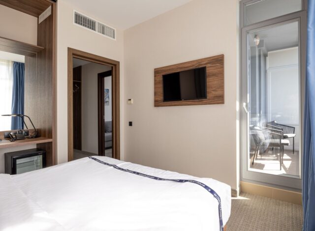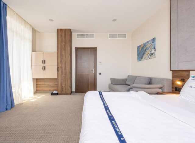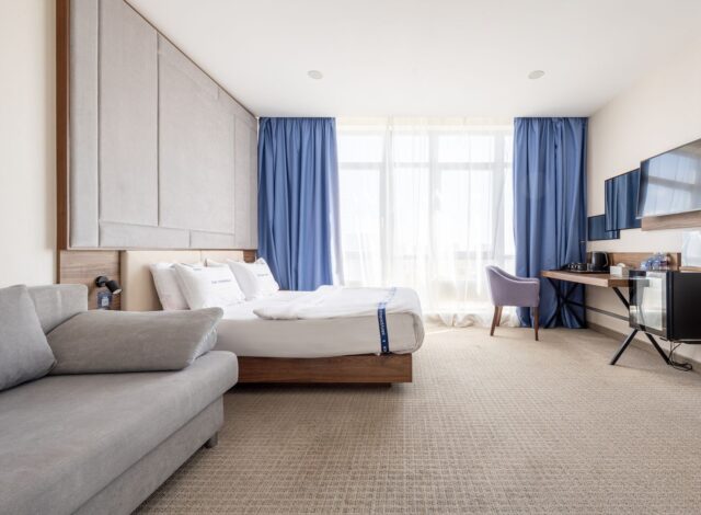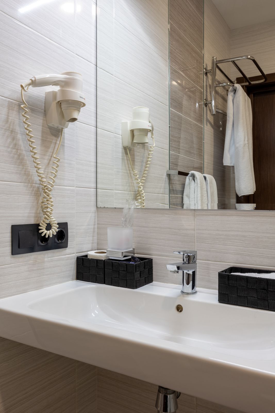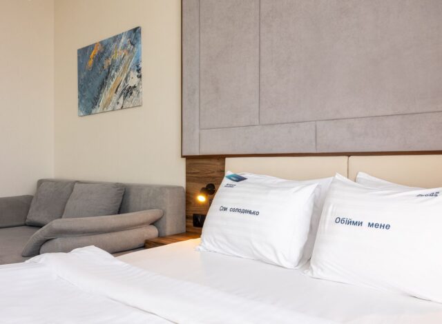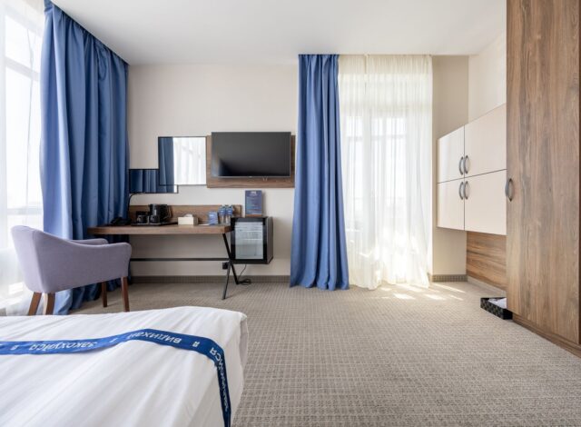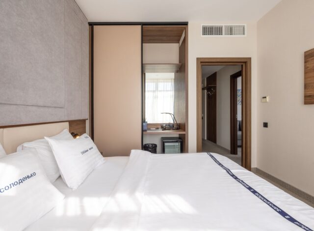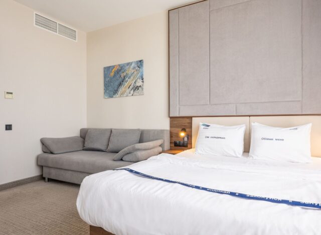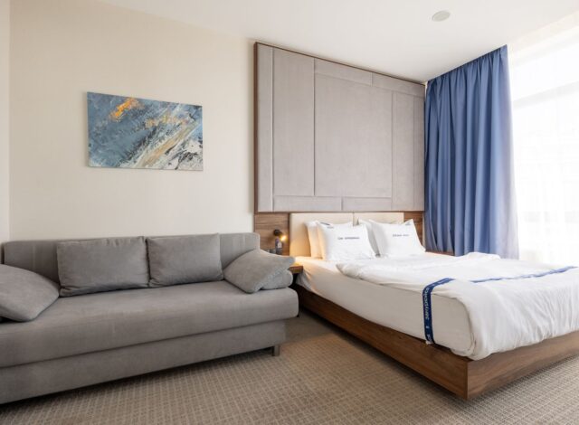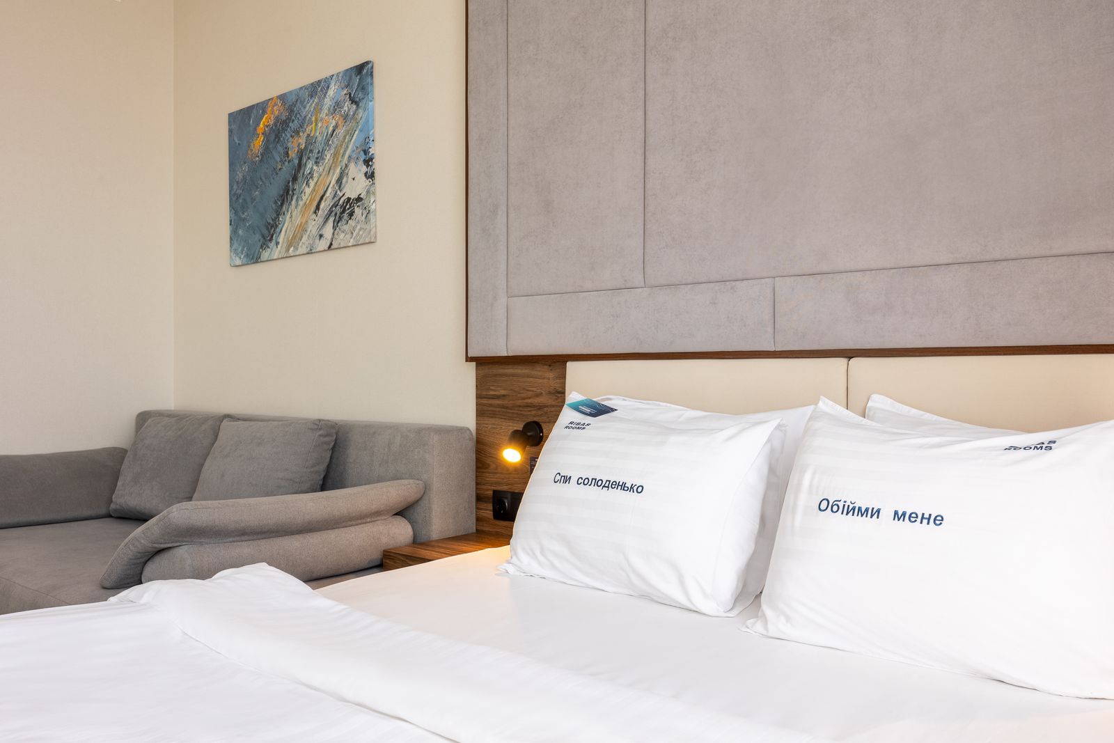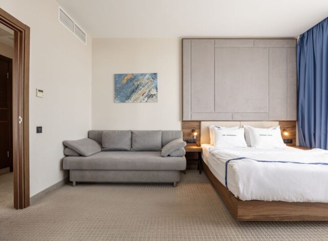 Люкс 2-комнатный — это категория стильных и очень уютных номеров. Предназначены для проживания большой компании или семьи. Номер вместительный, площадь — 35 кв. м, выполнен в современном стиле, имеет изысканный внешний вид. В комнатах оборудованы рабочая зона с письменным столом, а также место для отдыха — с большим диваном и плазменным телевизором. В номере есть личный санузел, полы в душевой кабине подогреваются, также предоставляются банные принадлежности.