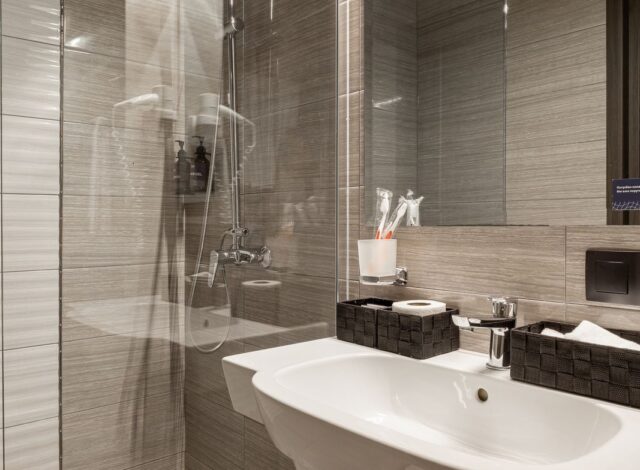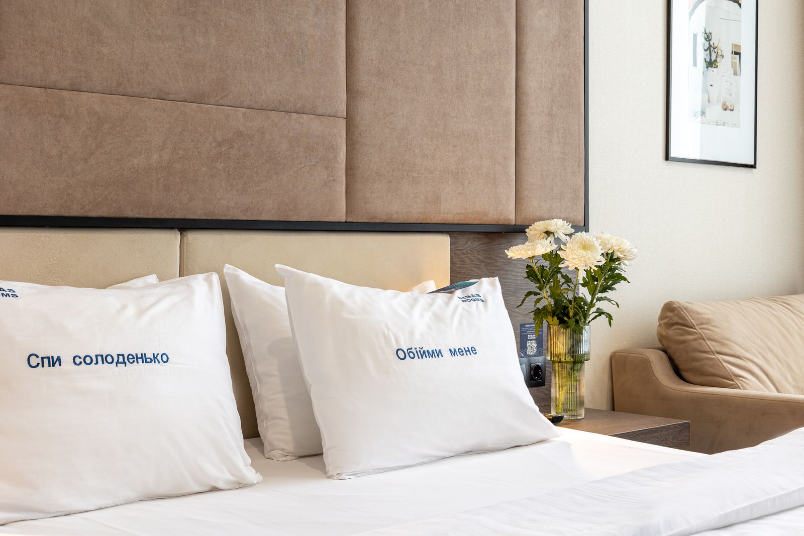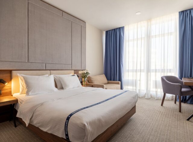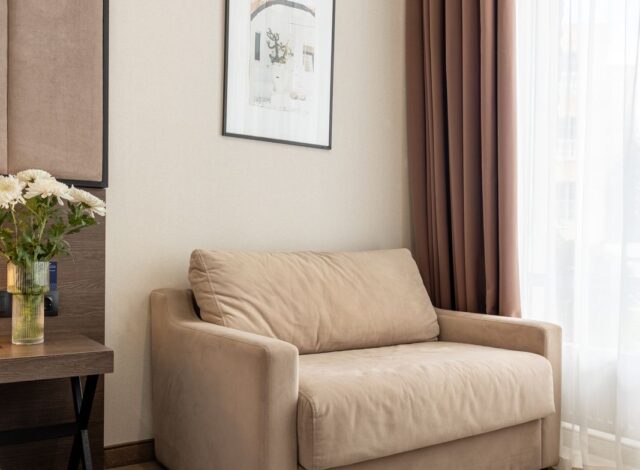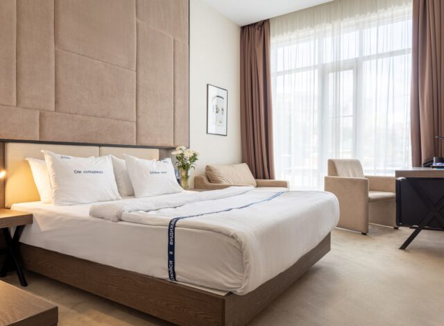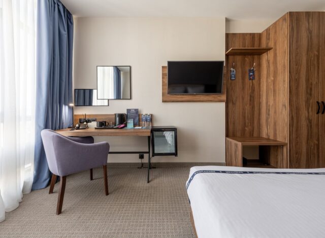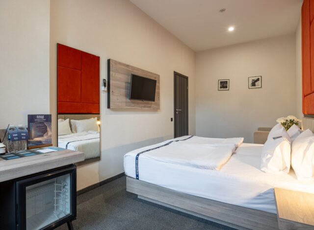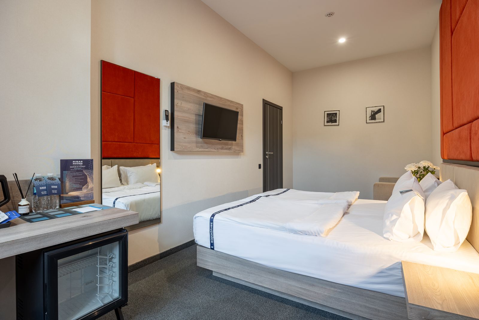 Полулюкс — это категория уютных и роскошных номеров для проживания двух человек. Площадь комнаты составляет 22 кв. м, есть двуспальная кровать и кресло — дополнительное спальное место. Также в номере оборудована рабочая зона и большое зеркало для подготовки к важным мероприятиям. Санузел личный, в душевой кабине установлен пол с подогревом. Номер подойдет как для деловой поездки, так и для романтического или семейного отдыха.